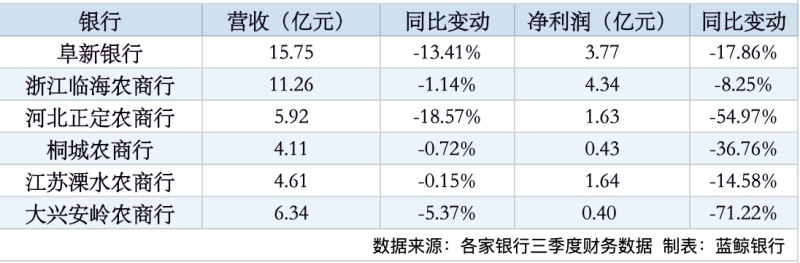 值得一提的是,还有6家银行出现了营收净利双双同比下降的情况,分别是阜新银行、临海农商行、正定农商行、桐城农商行、溧水农商行和大兴安岭农商行。