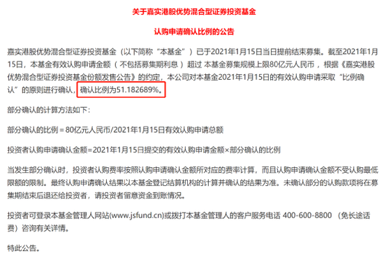 从近期公告看,在近期新基金发行市场,因为市场过于火爆,新基金一日售罄并出现末日配售已经成为“常态”。如嘉实港股优势限购80亿,最终确认比例为51.18%,意味着该基金引来156.3亿的认购资金。
