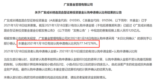 而1月18日发行的广发成长精选,限额120亿,配售比例是77.15%,认购量达到155.55亿元。