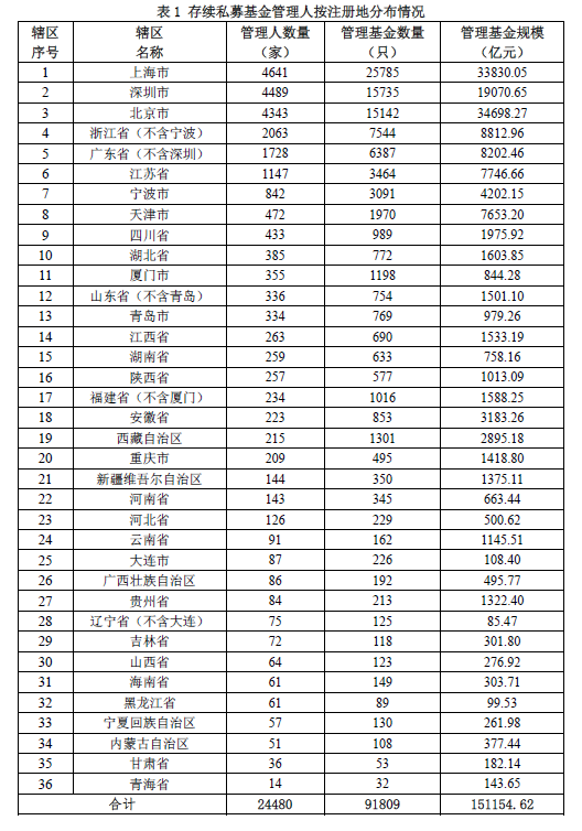 截至2020年9月末,已登记私募基金管理人数量从注册地分布来看(按36个辖区),集中在上海市、深圳市、北京市、浙江省(除宁波)和广东省(除深圳),总计占比达70.52%,略低于7月份的70.59%。其中,上海市4641家、深圳市4489家、北京市4343家、浙江省(除宁波)2063家、广东省(除深圳)1728家,数量占比分别为18.96%、18.34%、17.74%、8.43%和7.06%。